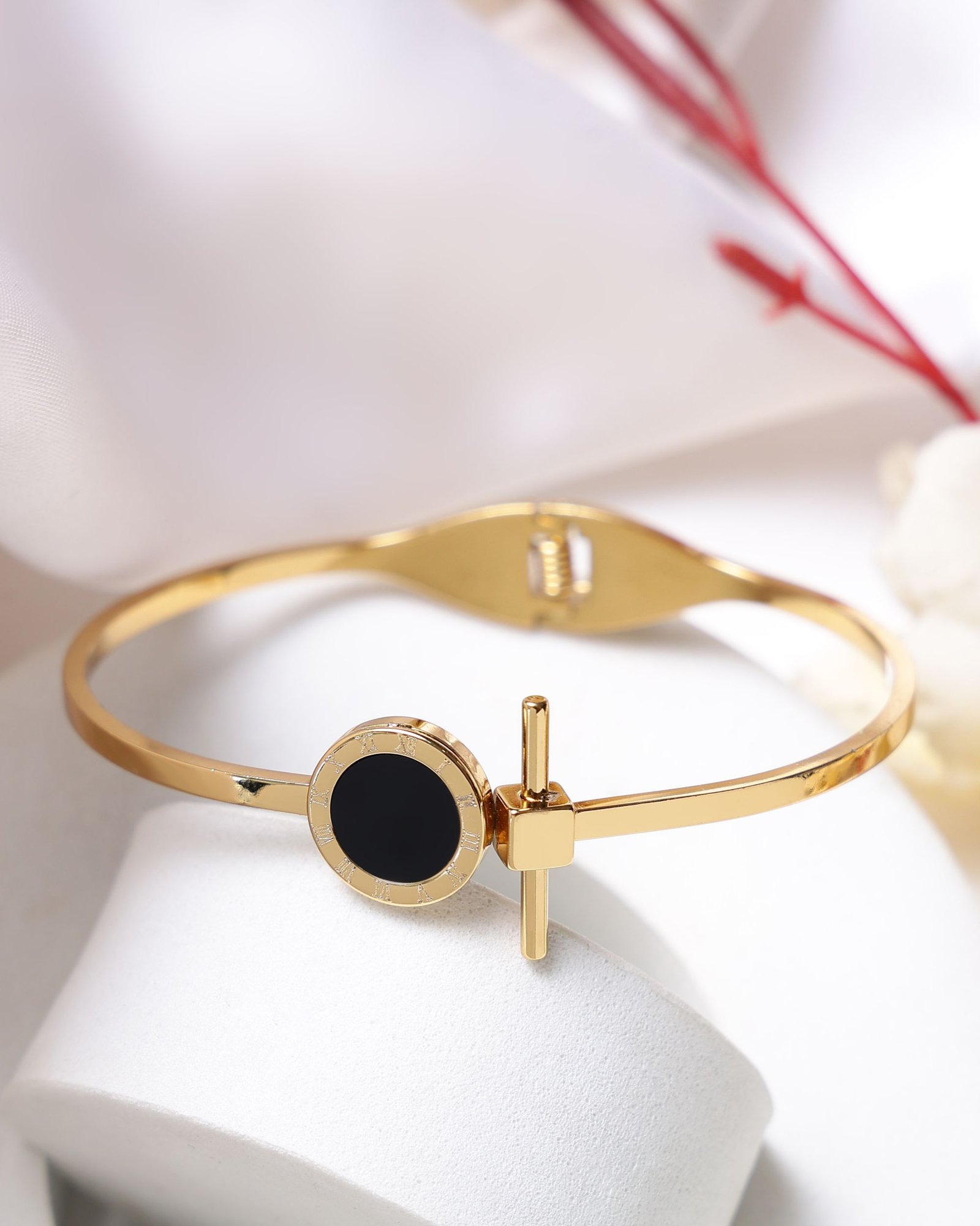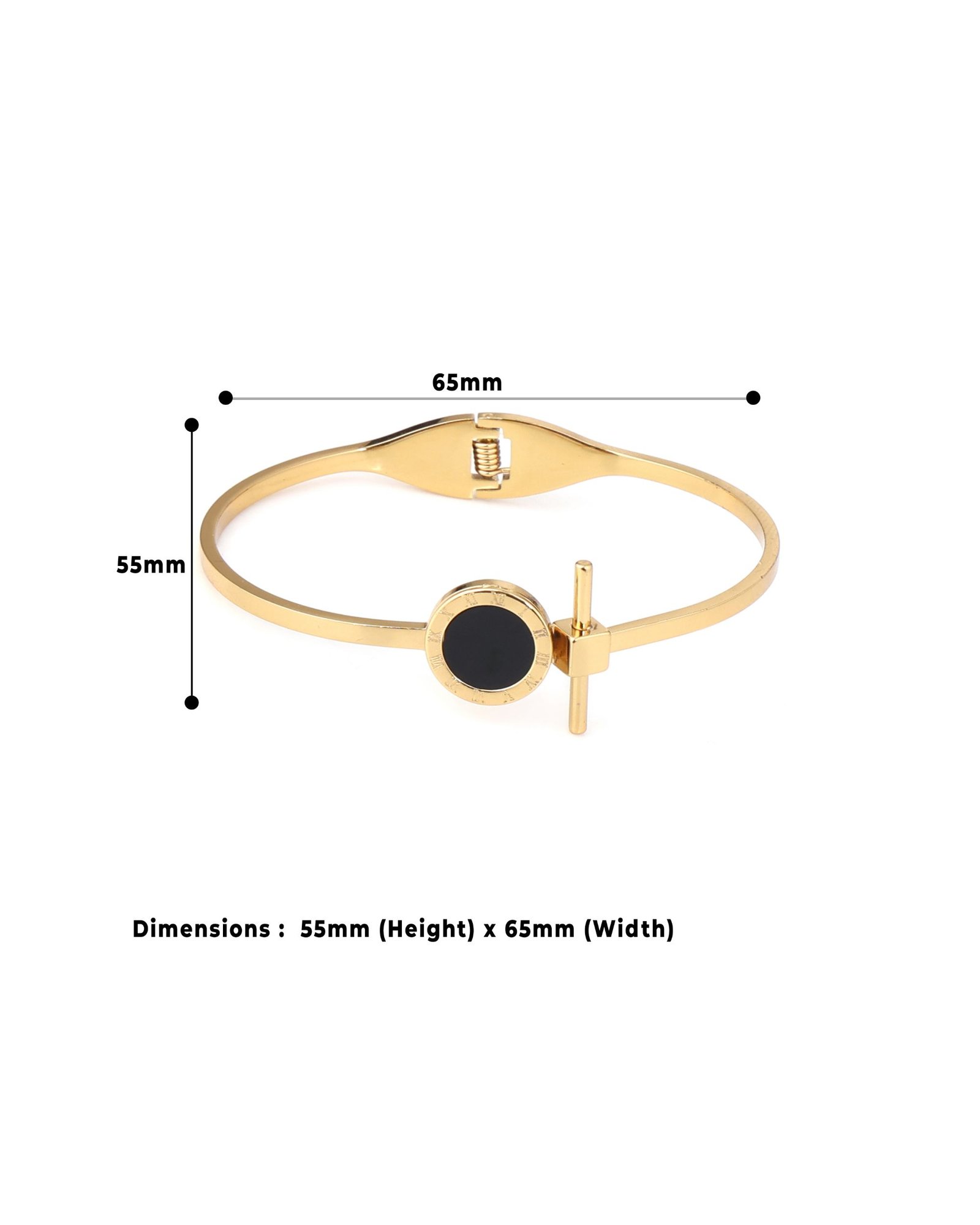 Premium 18K Gold-Plated Stainless Steel Bracelet crafted from durable steel for lasting shine and reliable everyday wear. Designed with a modern black enamel round motif and a sleek bar accent, it delivers a clean and elegant look. Built for a comfortable fit on wrists up to 17 cm, it features an adjustable closure for a flexible and secure fit. Anti-tarnish, water- and sweat-resistant, and hypoallergenic, this lightweight bracelet offers smooth, irritation-free comfort for effortless daily styling.