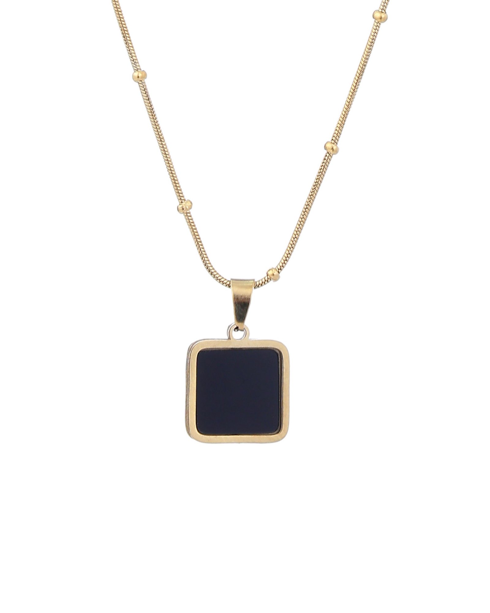 18K Gold-Plated Stainless Steel Necklace crafted from anti-tarnish steel for lasting shine and everyday durability. Designed with a square black pendant framed in polished gold, delivering a clean, modern look. Sweat and water resistant with a hypoallergenic finish, ensuring comfortable daily wear. Features a 38 cm chain with a 6 cm adjustable extender for a versatile, customizable fit. Weighing approximately 4 g, it offers a lightweight, balanced feel for everyday refinement.