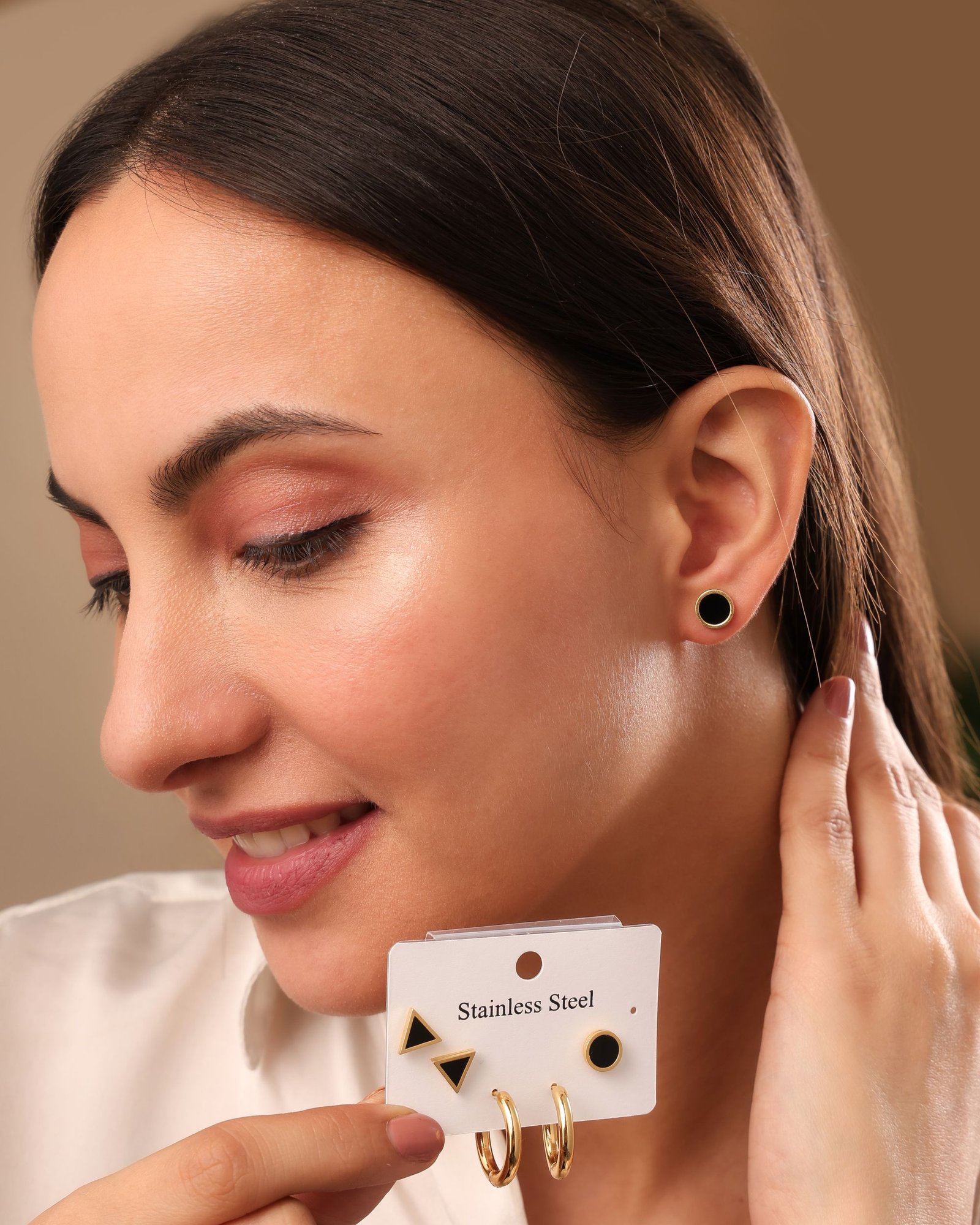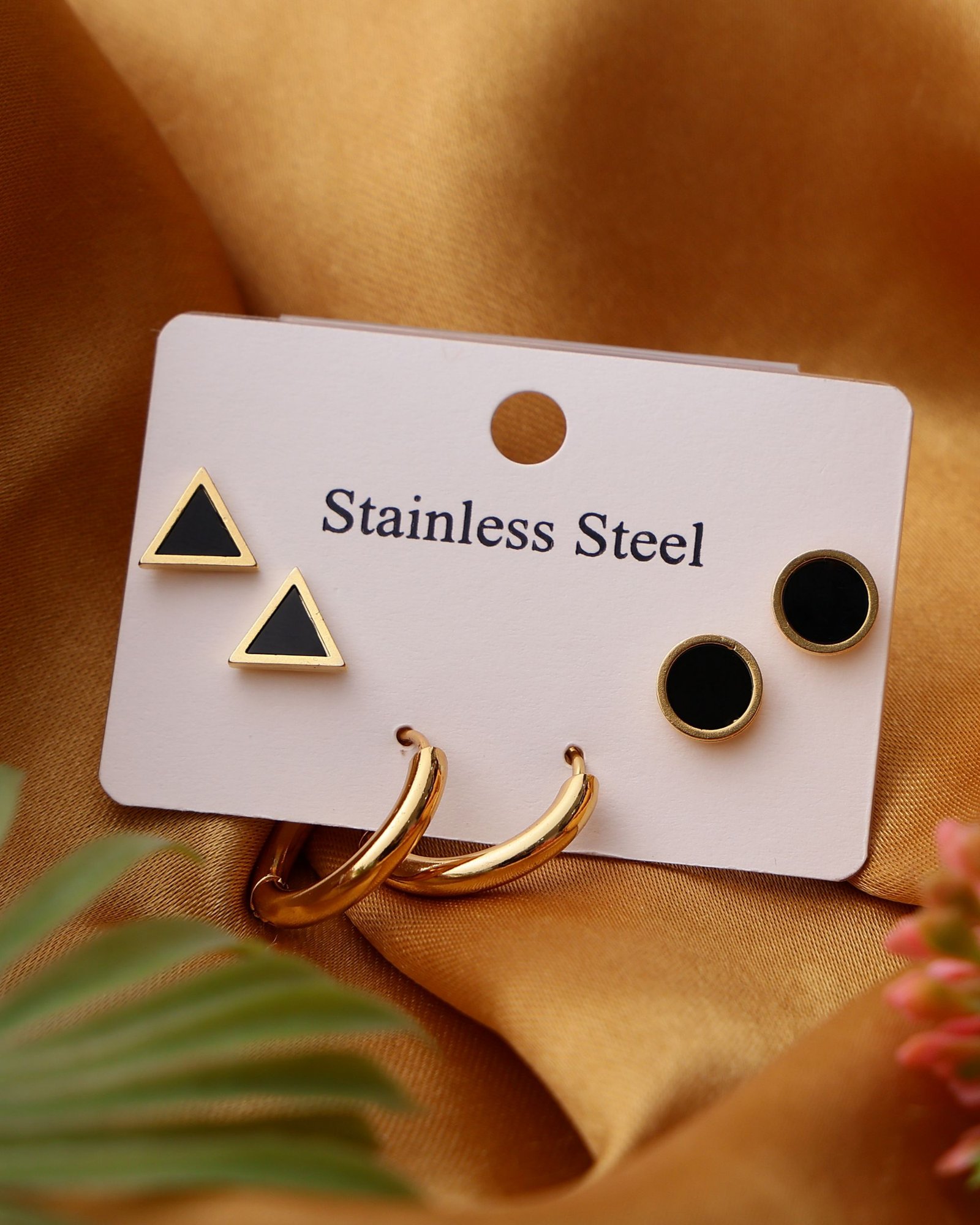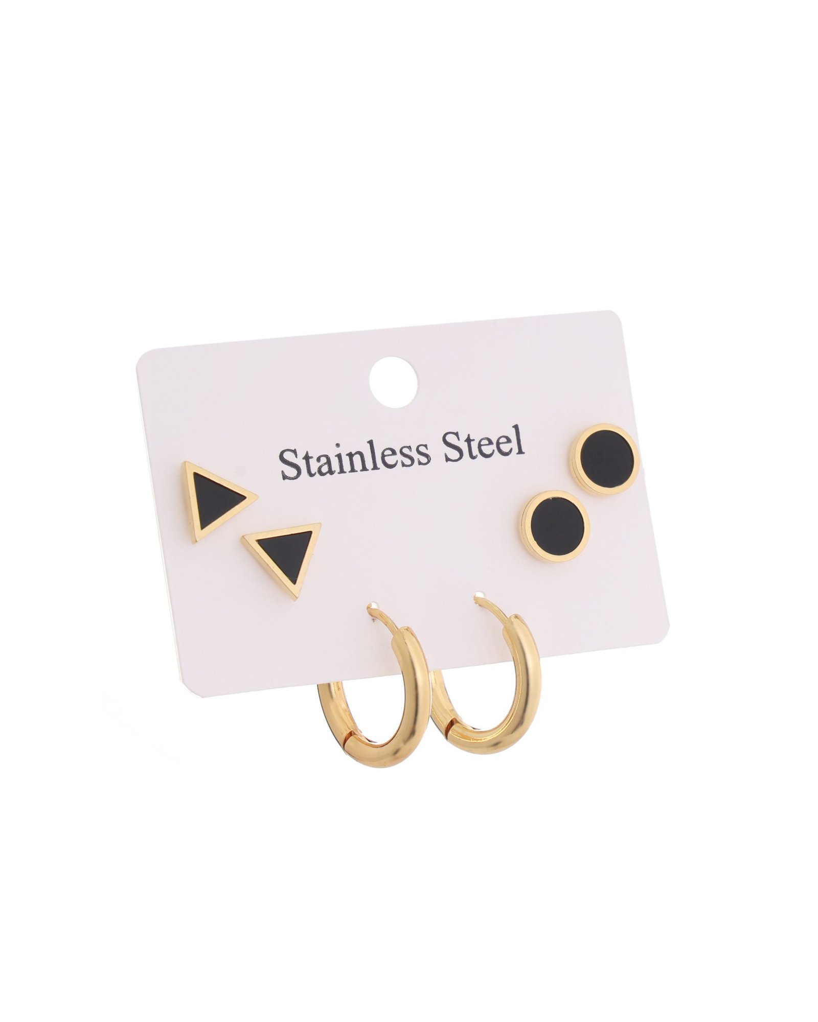 Trendy 3-Pair Stud Earring Combo featuring black triangle studs, black round enamel studs, and polished gold mini hoops—perfect for modern styling and multi-piercing looks. Crafted from premium stainless steel for durability, shine, and long-lasting performance. Finished with Aurivelle’s protective anti-tarnish gold plating to help maintain brightness and reduce fading over time. Water and sweat resistant, making it suitable for Indian humidity and everyday wear. Each earring measures approximately 5 mm × 5 mm × 2 mm, with a total set weight of 8 g, offering lightweight, hypoallergenic, nickel-free comfort for sensitive ears.