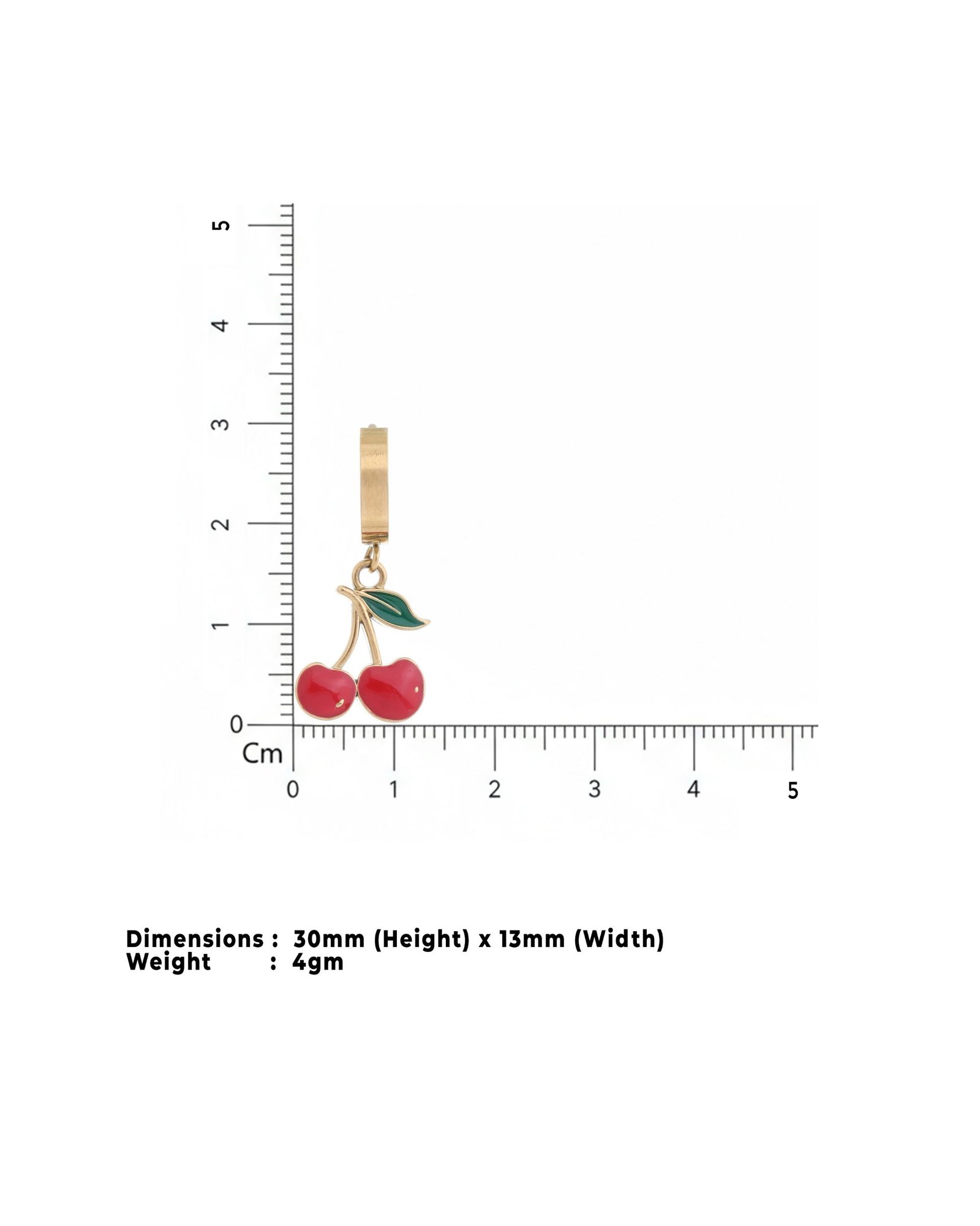 Playful Cherry Drop Earrings featuring a charming cherry motif detailed with glossy red enamel and delicate green leaf accents—designed to add a fresh, youthful touch to everyday styling. Crafted from premium stainless steel for durability and long-lasting structure, these earrings are finished with advanced 18K anti-tarnish gold plating to help maintain shine and resist fading with regular wear. The smooth polished surface and rounded edges ensure comfortable, irritation-free wear throughout the day. Lightweight at just 4 g, these earrings are ideal for casual outfits, college wear, dresses, and festive looks, offering a fun yet refined statement accessory.