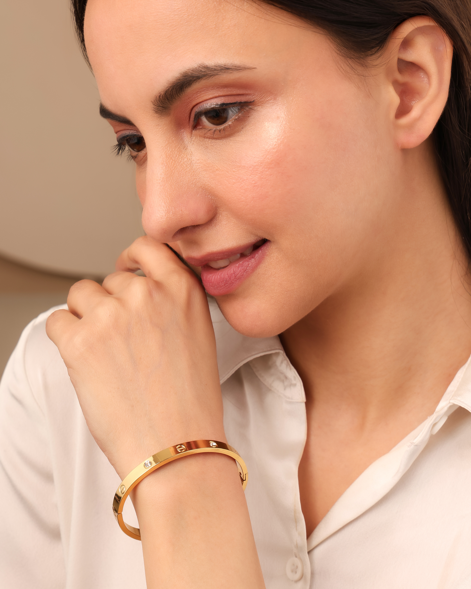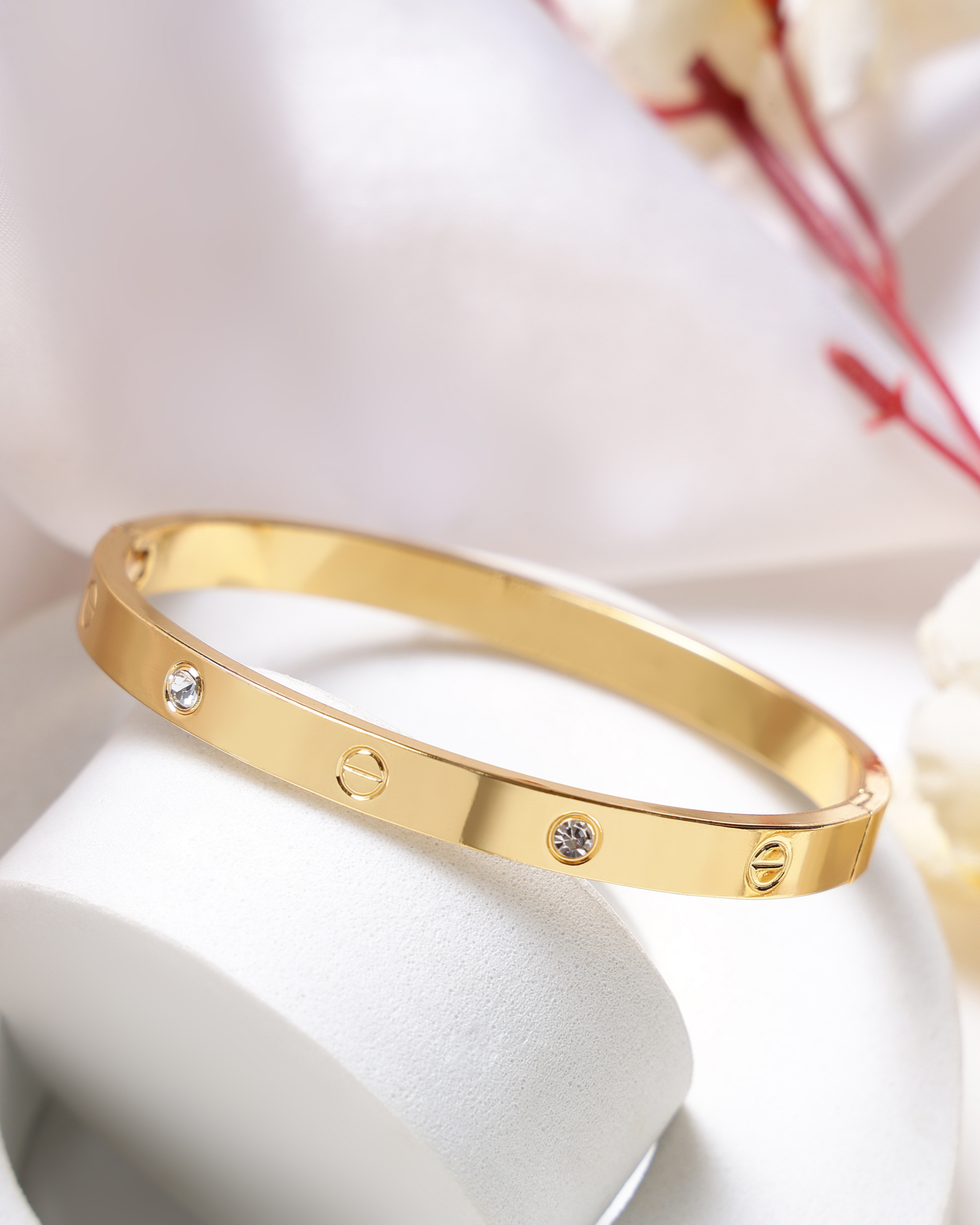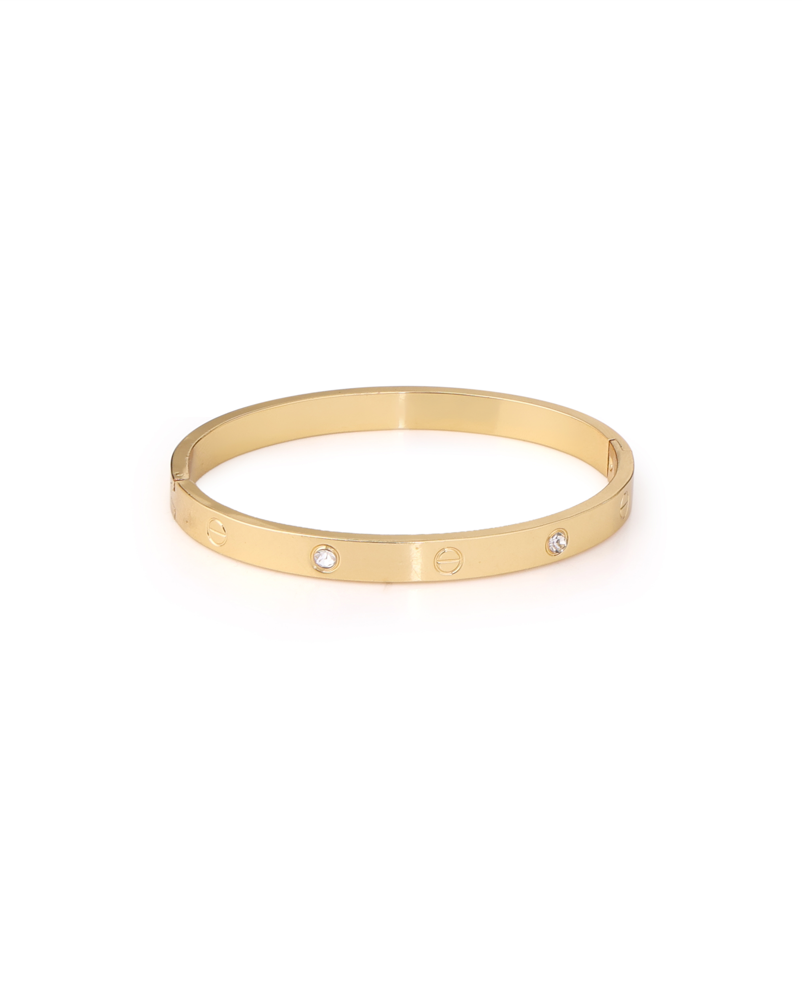 Premium Anti-Tarnish 18K Gold-Plated Stainless Steel Bracelet crafted from durable steel for long-lasting shine and everyday wear resistance. Designed with a classic screw motif and clear crystal accents, it delivers a refined luxury-inspired look. Built for a comfortable fit on wrists up to 17 cm, it includes an adjustable closure for a secure and flexible fit. Water- and sweat-resistant with a hypoallergenic, skin-friendly finish, this bracelet offers smooth, irritation-free all-day comfort and effortless everyday styling.