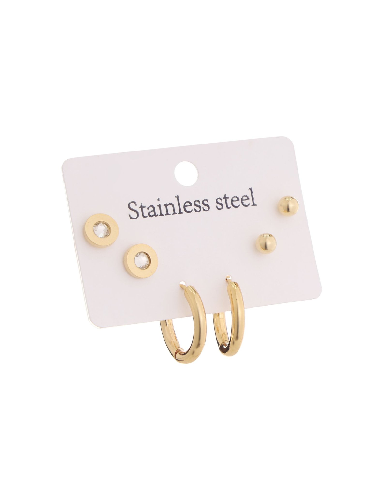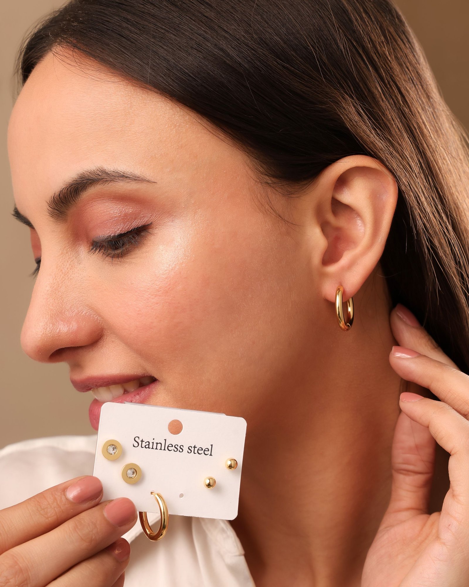 Classic 3-Pair Stud Earring Combo featuring sparkling crystal round studs, minimal gold ball studs, and smooth gold mini hoops—ideal for daily wear, work styling, and multi-piercing looks. Crafted from premium stainless steel for durability, shine, and long-lasting wear. Finished with Aurivelle’s advanced anti-tarnish gold plating to help keep the earrings bright and prevent fading over time. Water and sweat resistant, making them suitable for Indian humidity and everyday moisture exposure. Each earring measures approximately 5 mm × 5 mm × 2 mm, with a total set weight of 8 g, offering comfortable, hypoallergenic, nickel-free wear for sensitive ears.