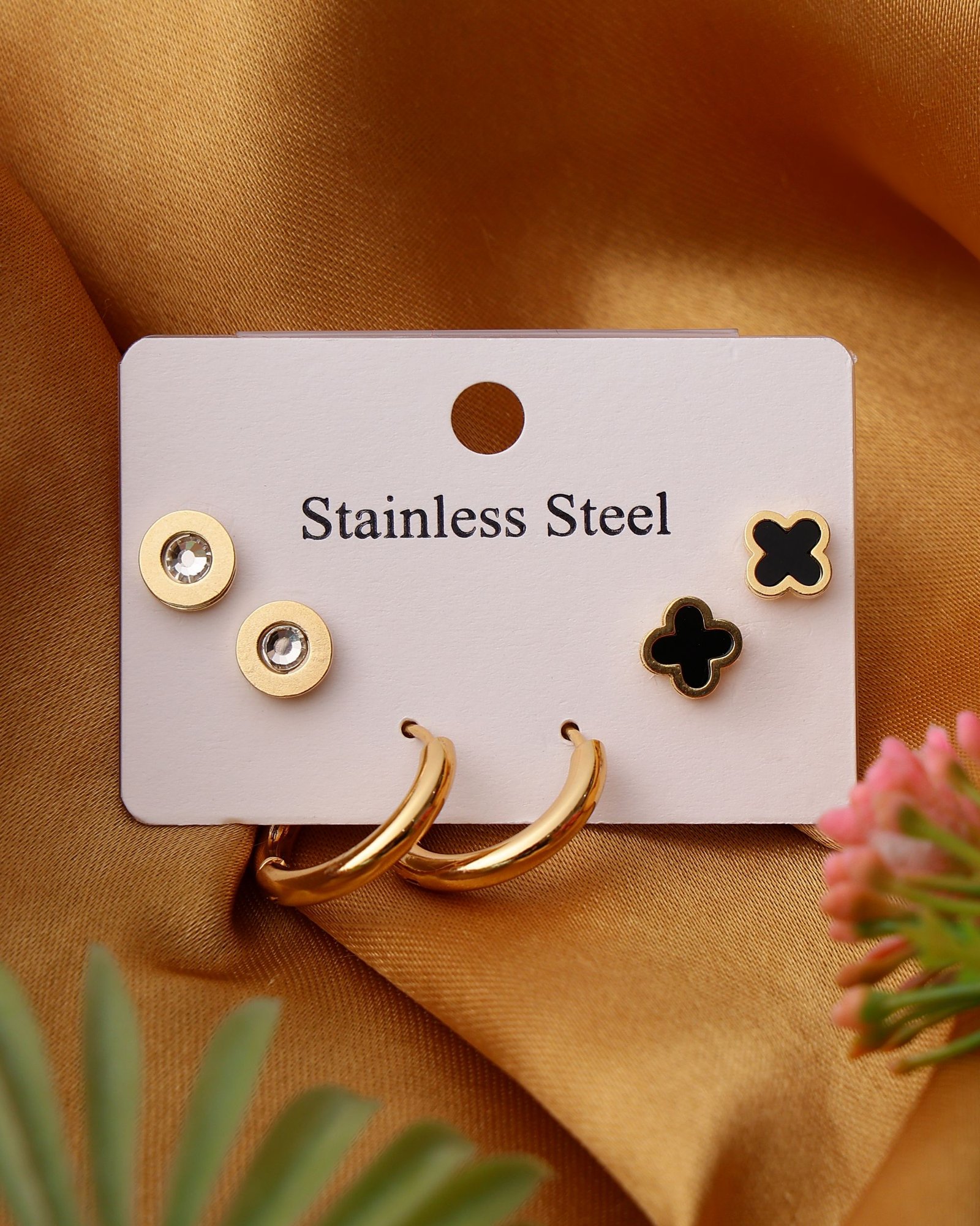 Stylish 3-Pair Earring Combo Set featuring crystal round studs, black clover studs, and smooth polished mini hoops—ideal for everyday wear, office styling, and multi-piercing looks. Crafted from premium stainless steel for durability, rust resistance, and long-lasting shine. Finished with Aurivelle’s advanced anti-tarnish gold plating to help preserve color and surface quality over time. Water and sweat resistant, making it suitable for Indian climate conditions. Each earring measures approximately 5 mm × 5 mm × 2 mm, with a total set weight of 8 g, offering lightweight, hypoallergenic, skin-safe comfort.