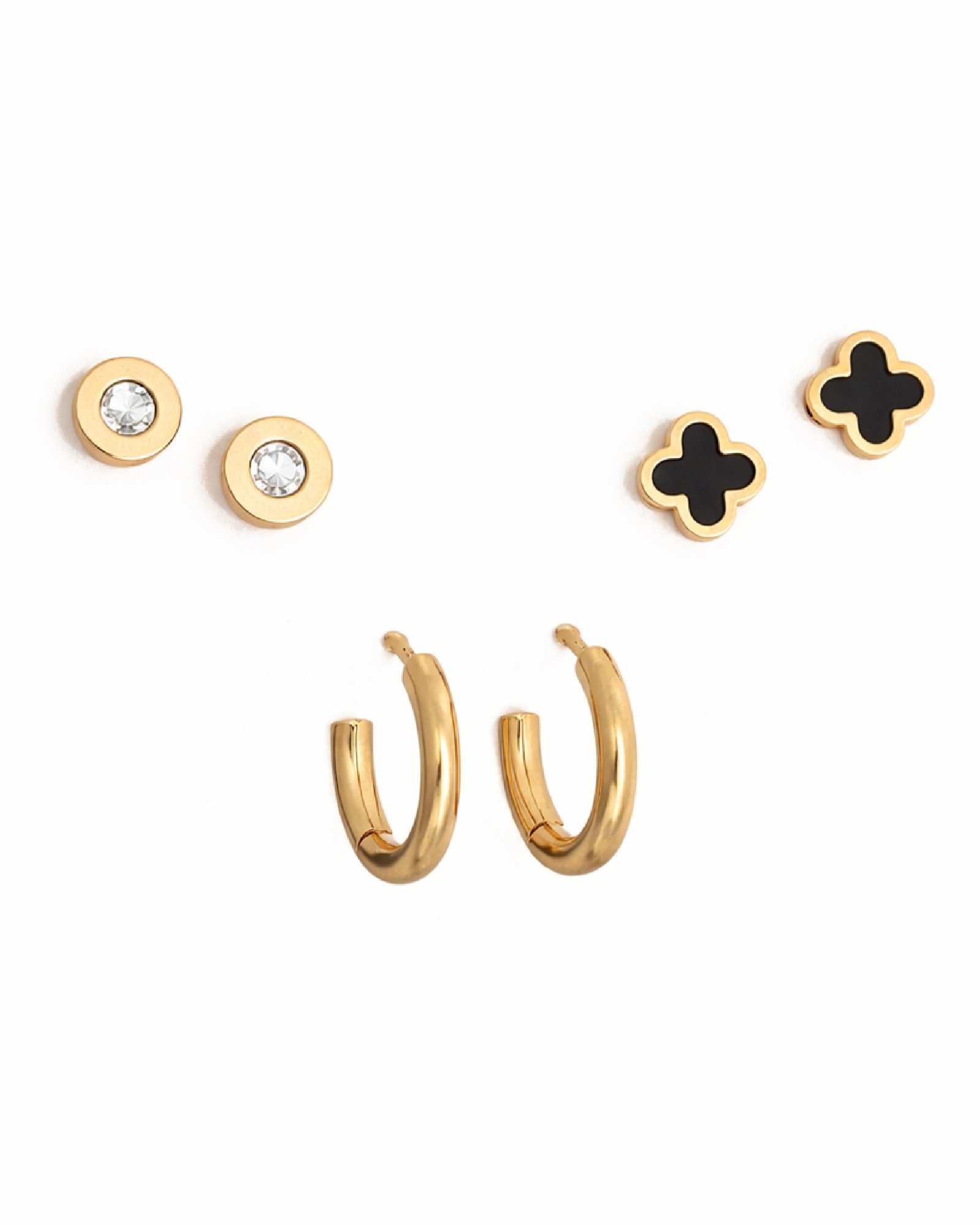 - Design Mix: Crystal round studs, black clover studs, and polished mini hoop earrings