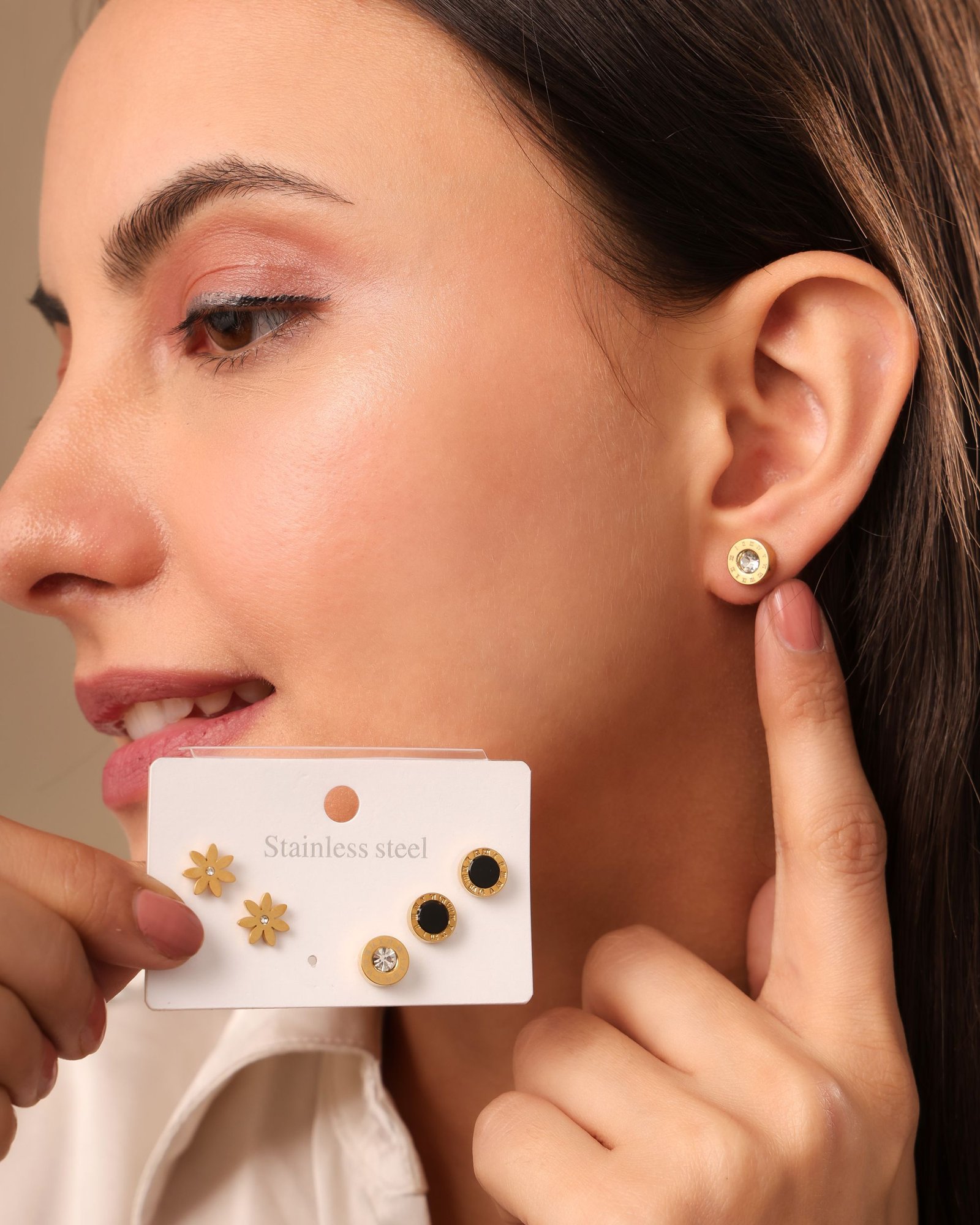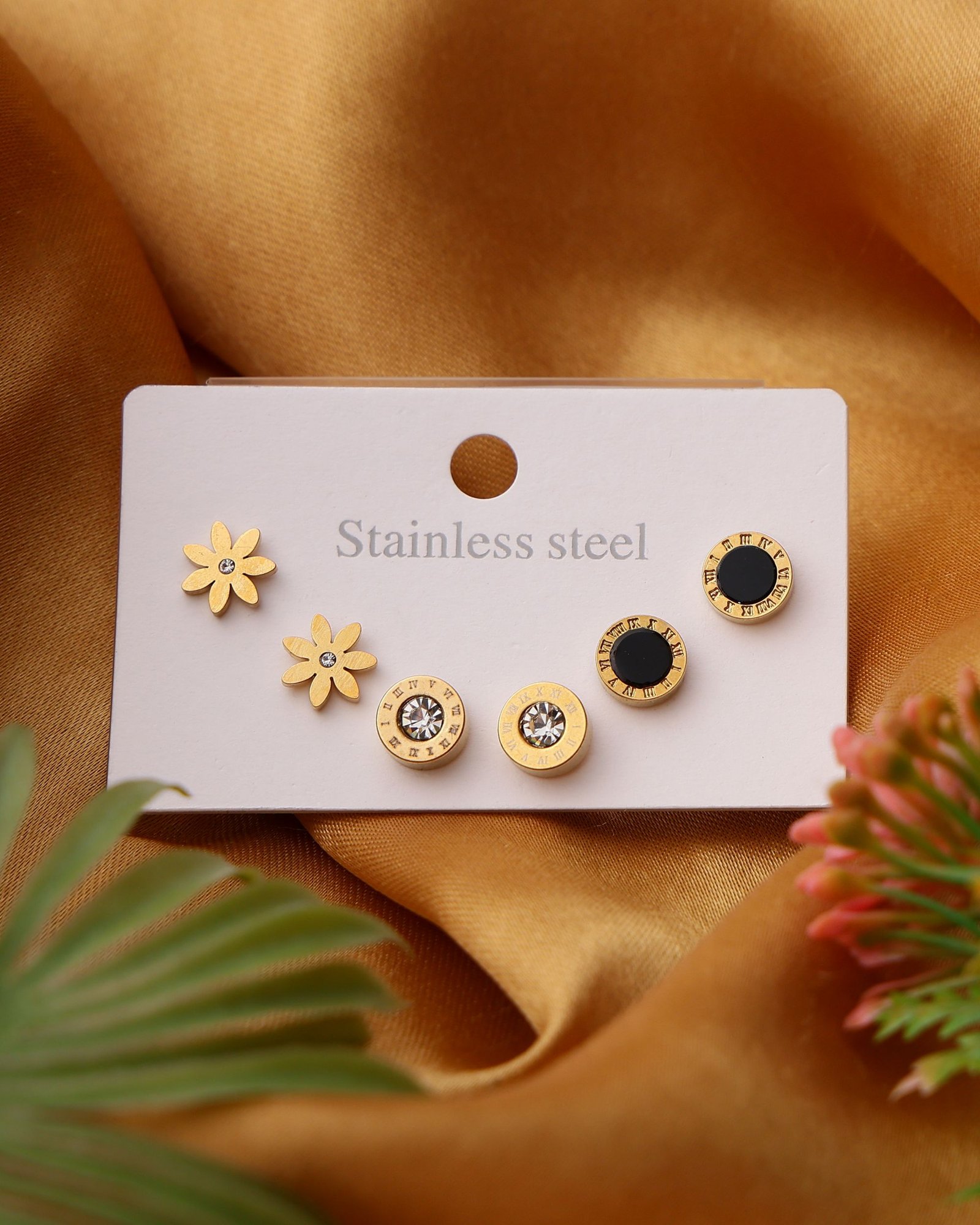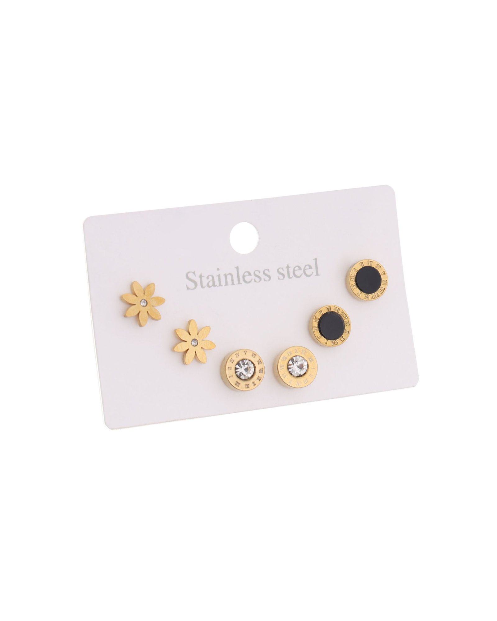 - Design Mix: Matte gold daisy studs, black enamel round studs, and Roman numeral crystal studs