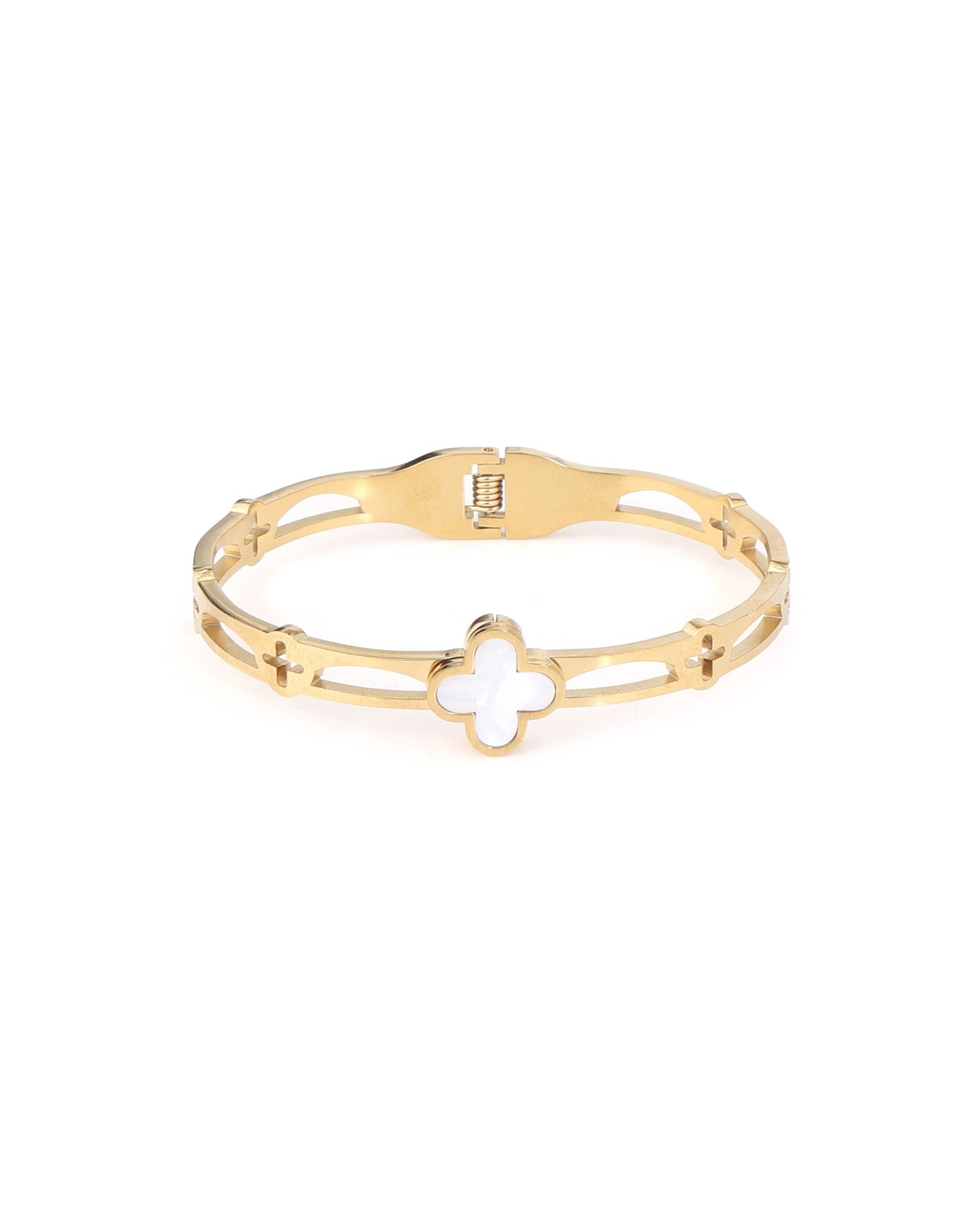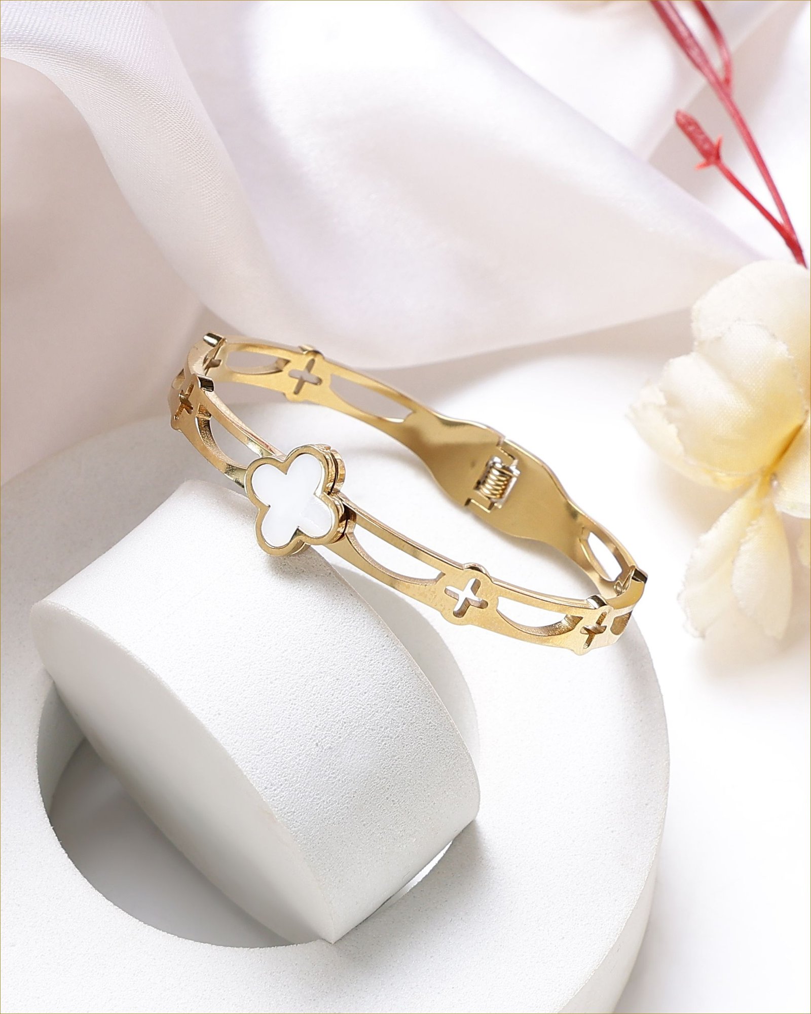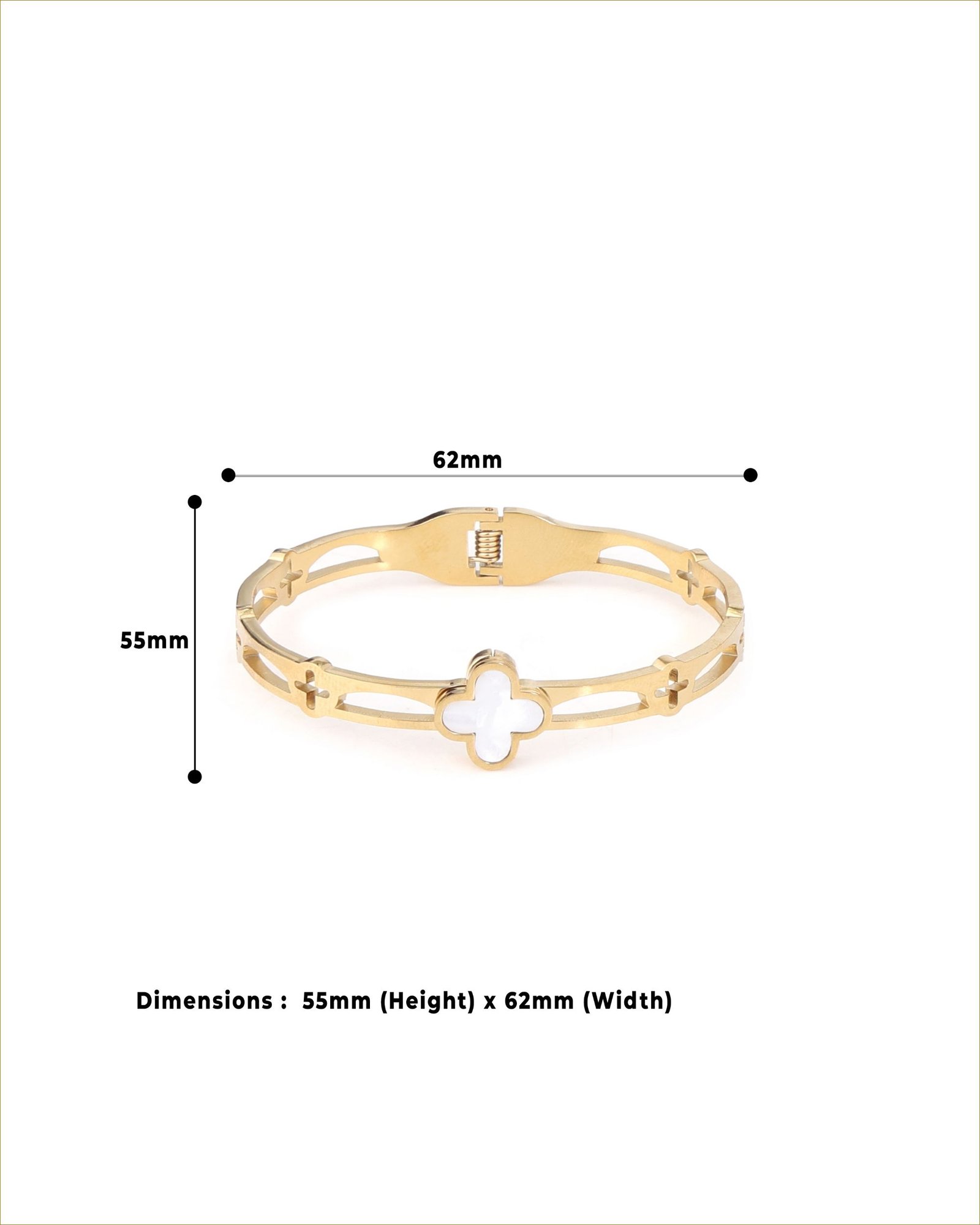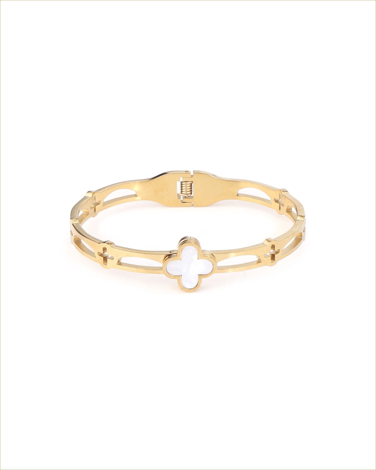 Premium Gold-Plated Stainless Steel Bracelet crafted from durable stainless steel with a rich 18K gold finish for lasting shine. Designed with an elegant Mother-of-Pearl clover motif, it adds a soft, natural glow to everyday styling. Built for a comfortable fit on wrists up to 17 cm, it includes an adjustable closure for a secure and flexible fit. Anti-tarnish, water- and sweat-resistant, and hypoallergenic, this lightweight bracelet offers smooth, irritation-free comfort for effortless daily wear.