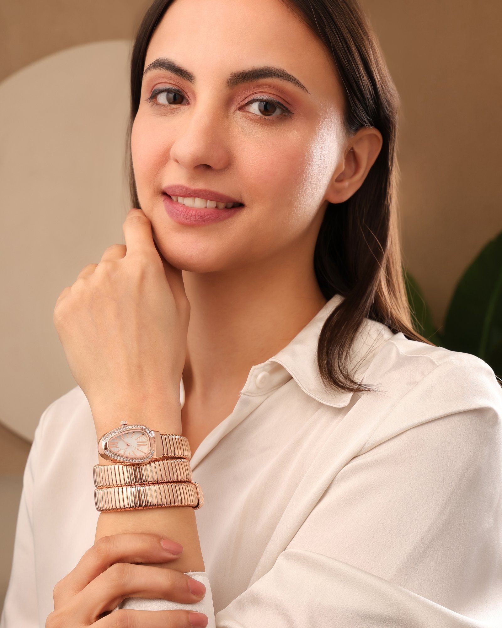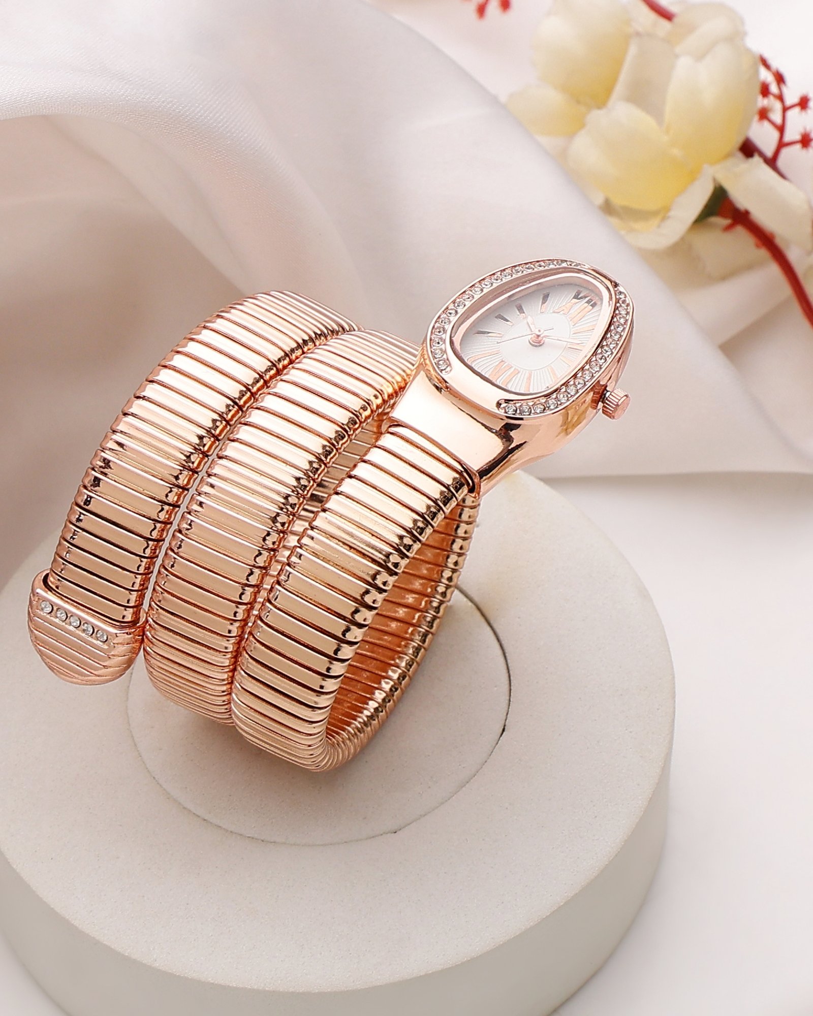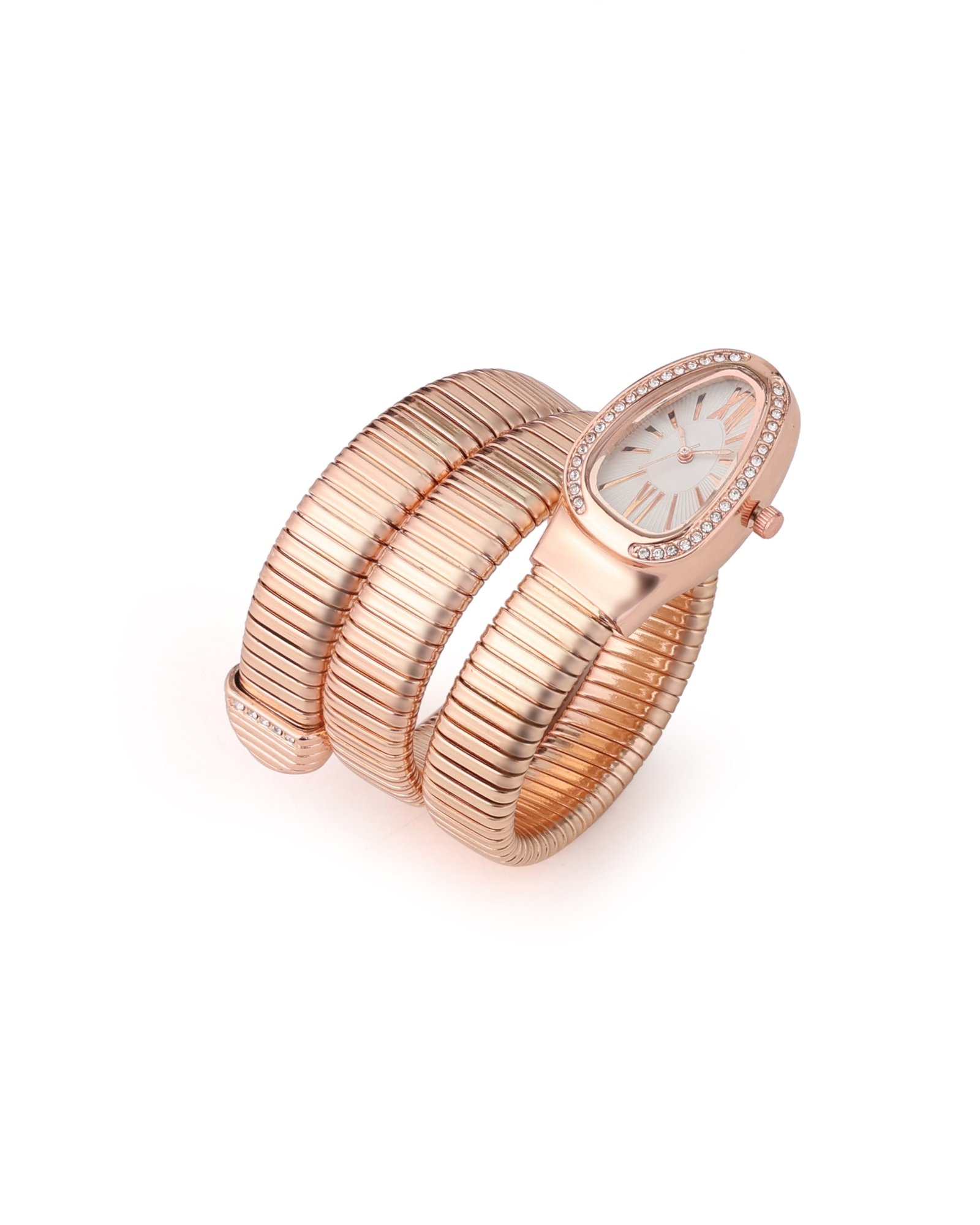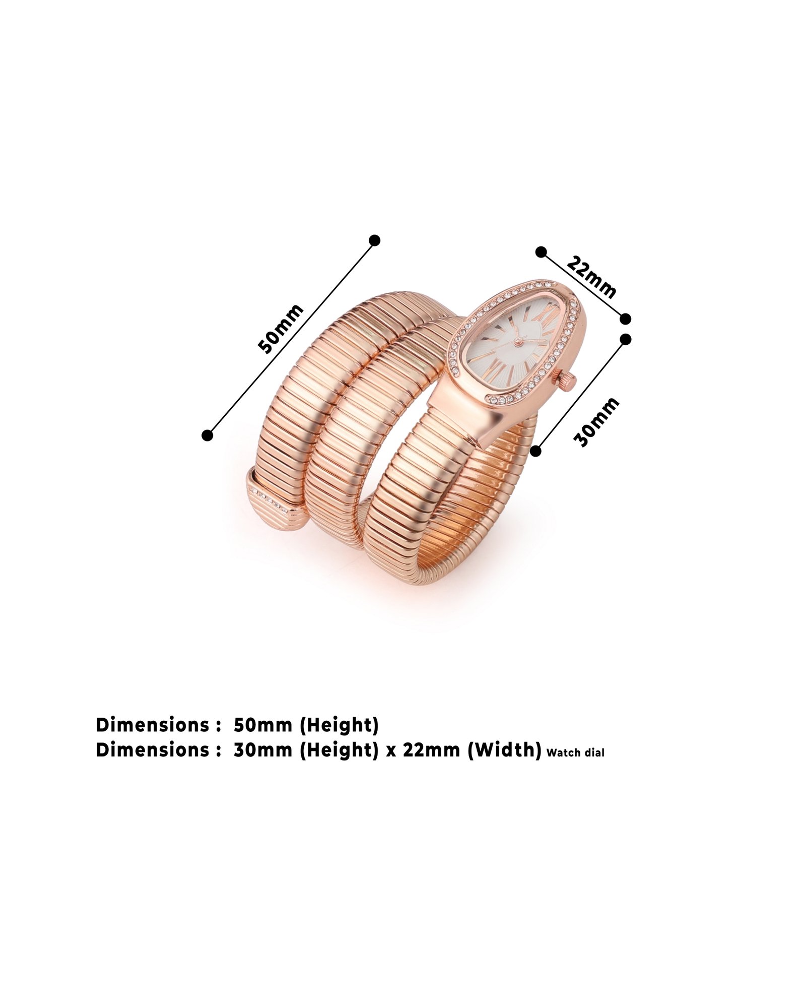 Luxury Rose Gold Finish Wrap-Style Watch Bracelet crafted from premium anti-tarnish stainless steel with durable 18K rose gold plating for a rich, high-fashion shine. Designed with a flexible snake-coil inspired band, it wraps smoothly around the wrist, blending elegant bracelet styling with practical timekeeping. Built for a comfortable fit on wrists up to 17 cm, the adjustable and flexible coil structure ensures secure, easy wear. The refined white oval dial with rose-gold markers and a crystal-studded bezel adds a premium finishing touch. Water- and sweat-resistant with a hypoallergenic build, it offers stylish and reliable everyday comfort.