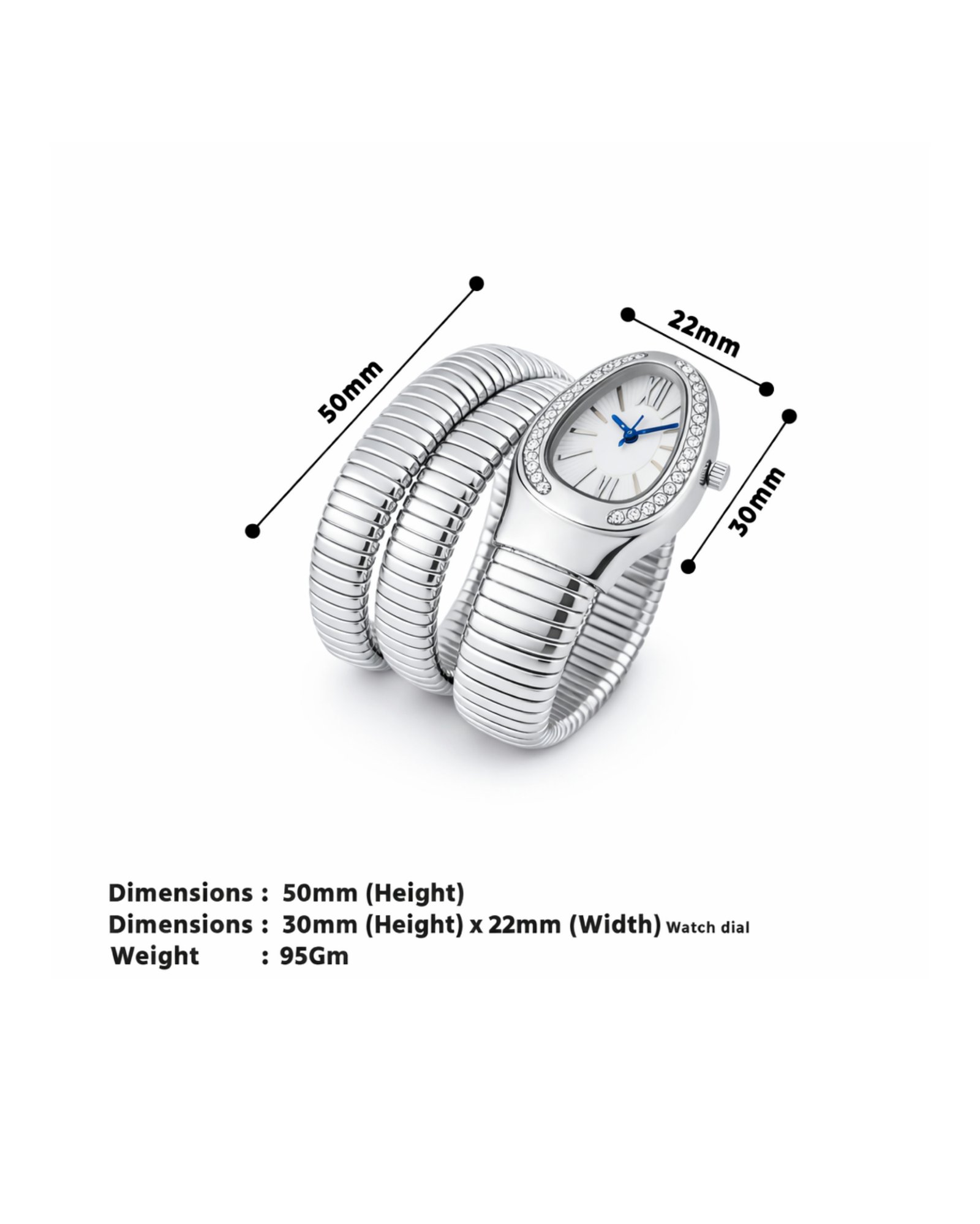 The Silver Finish Wrap Style Watch Bracelet blends elegant jewellery design with practical timekeeping for everyday wear. Crafted from high-quality stainless steel, it offers excellent durability, corrosion resistance, and long-lasting shine. The crystal-accented watch dial adds a stylish and functional touch, while the flexible ribbed coil structure ensures easy wear and all-day comfort. Designed for a comfortable fit on wrists up to 17 cm, it naturally adjusts to wrist movement without clasps or adjustments. The polished silver-tone finish creates a clean, modern look suitable for casual, office, and evening styling. With a solid 95-gram weight and premium construction, this bracelet watch delivers a luxurious feel and reliable everyday performance.