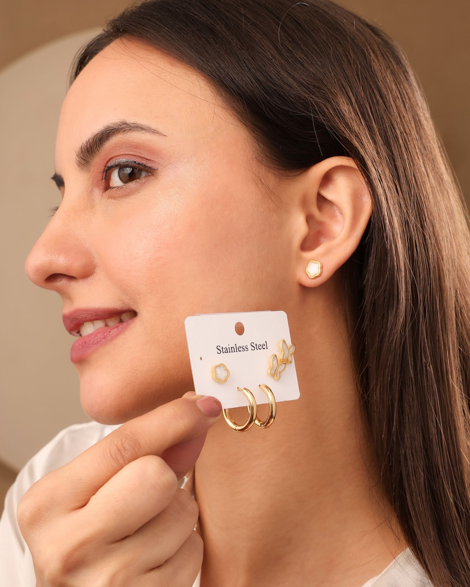 Combo of Three Elegant Earrings featuring white clover studs, butterfly outline studs, and smooth mini hoops—perfect for everyday styling, gifting, and multi-piercing looks. Crafted from premium stainless steel for durability, long-lasting shine, and resistance to daily wear. Finished with Aurivelle’s advanced anti-tarnish gold plating to help prevent dullness and fading over time. Water and sweat resistant, making them suitable for India’s climate and regular use. Each earring measures approximately 5 mm × 5 mm × 2 mm, with a total set weight of 8 g, ensuring lightweight comfort for all-day wear.