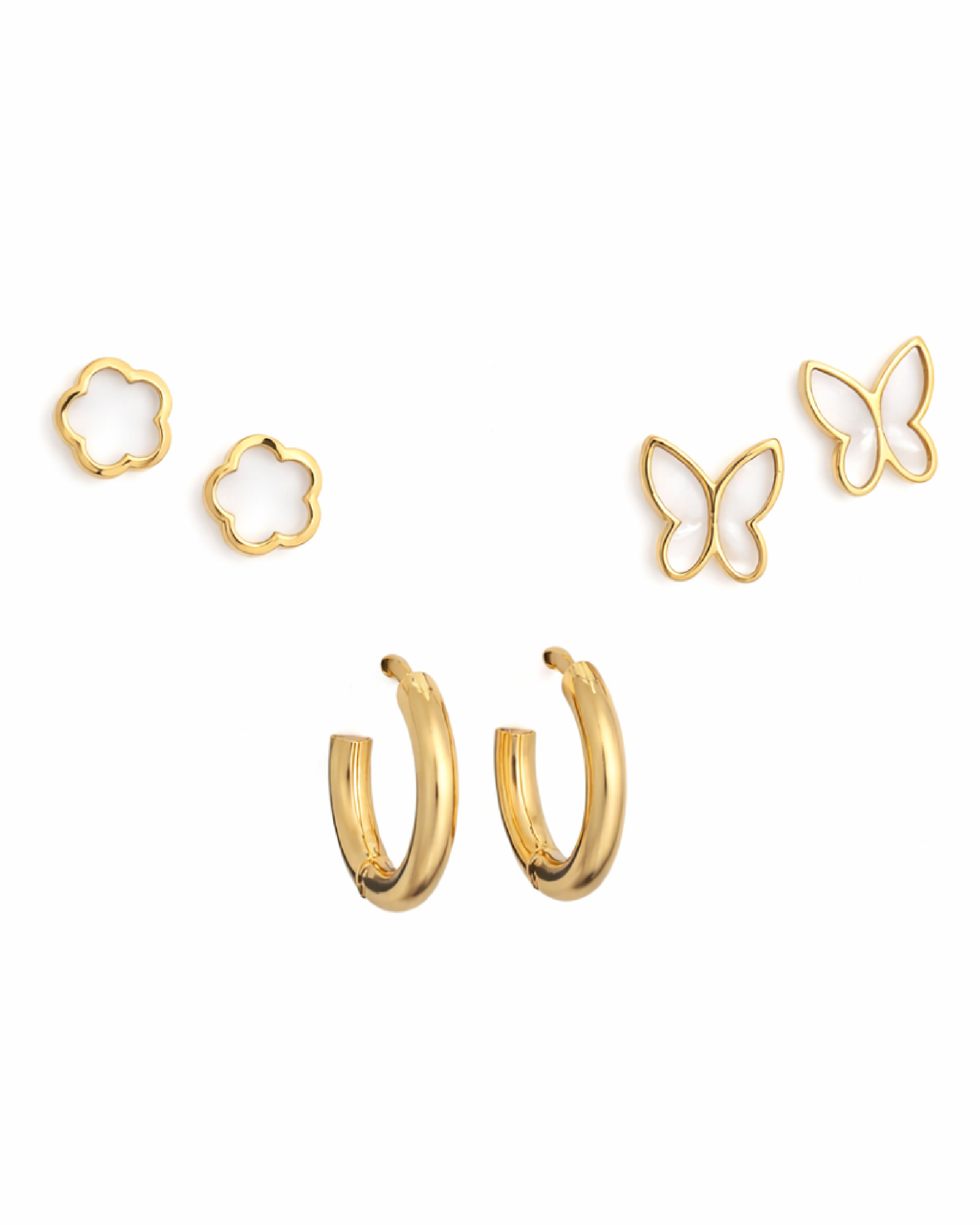 - Design Mix: White clover studs, butterfly outline studs, and smooth mini hoop earrings